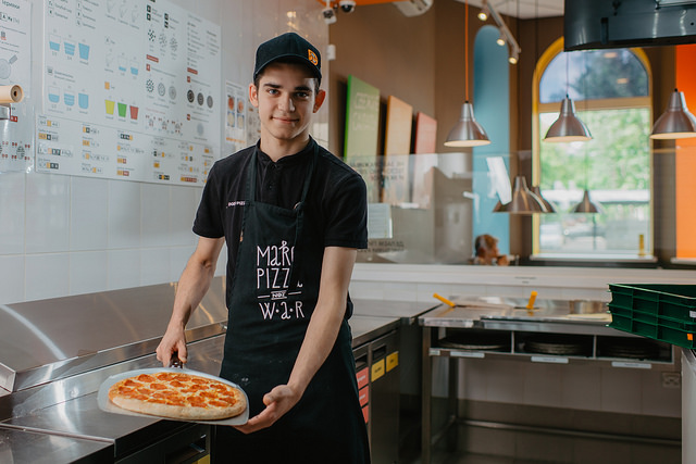 Все сотрудники пиццерий одеты в униформу. Наши фартуки настолько классные, что гости хотят забрать их с собой.