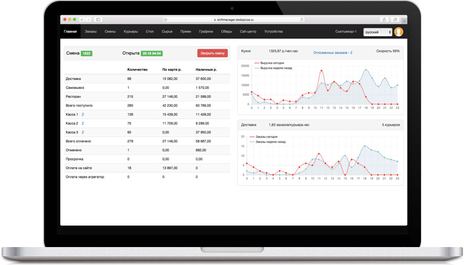 В одной пиццерии франчайзи устанавливает 5—9 планшетов с «Додо ИС». Руководитель и администратор управляют пиццерией с компьютера, мобильного телефона или планшета.